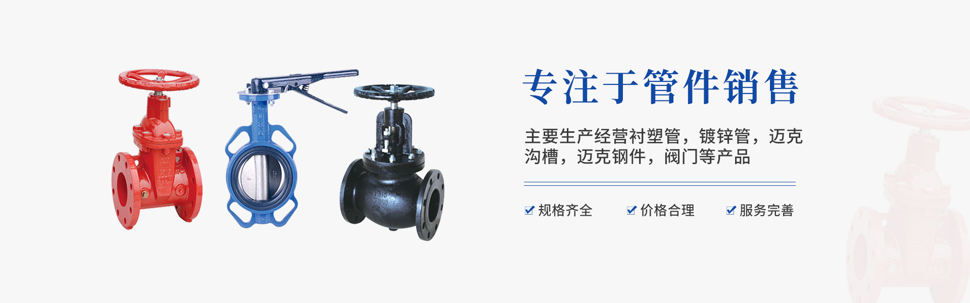 主要生產(chǎn)經(jīng)營(yíng)閥門(mén),溝槽管件,瑪鋼管件,消防軟管,不銹鋼管件,鋼材,電力儀表等產(chǎn)品咨詢熱線:18601254360